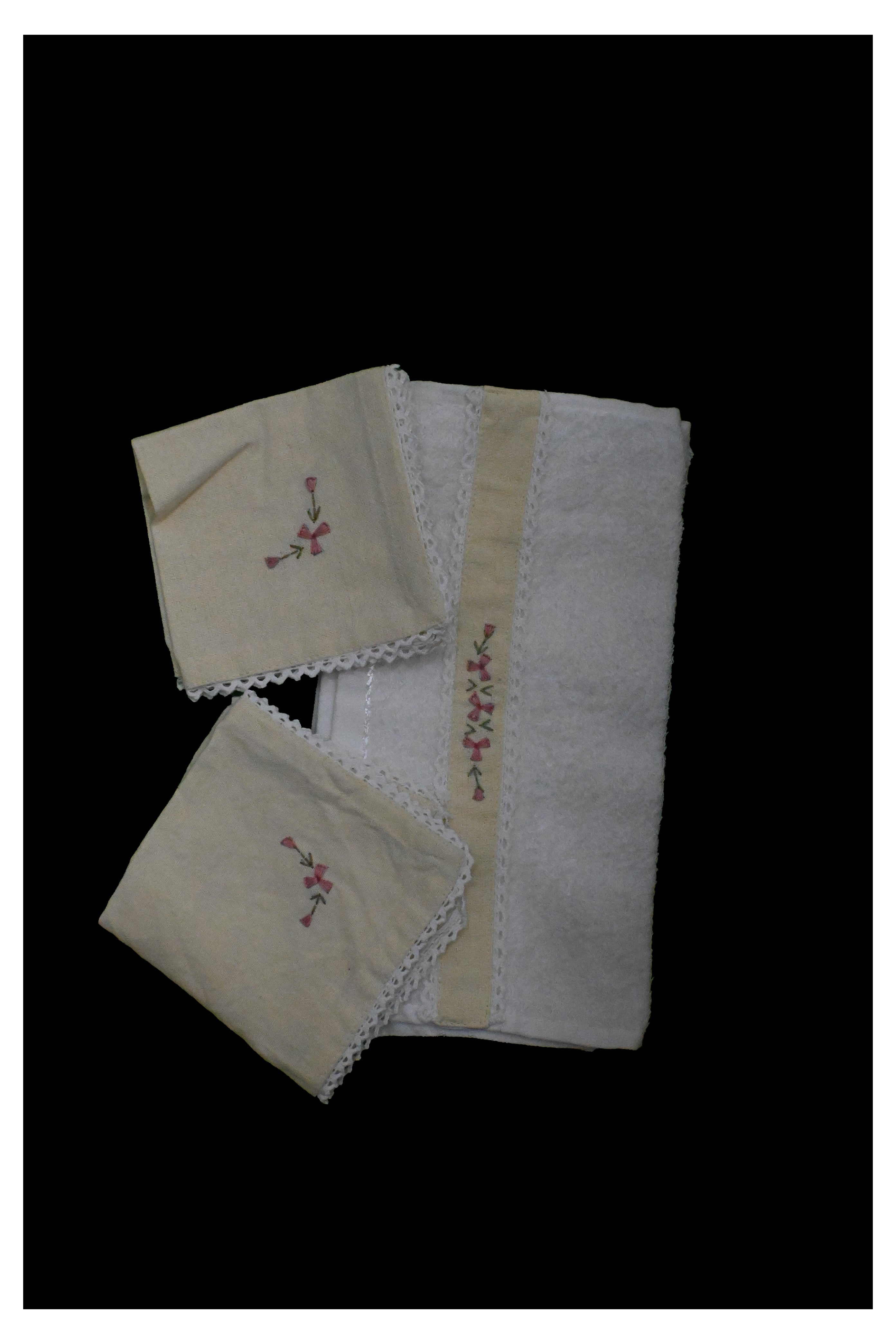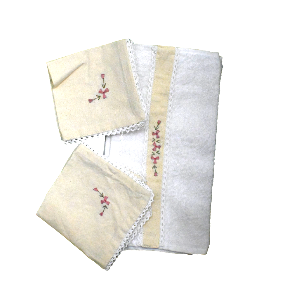 Butter yellow cotton napkins with delicate cotton crochet lace borders, hand-embroidered in soft pink. Matching white towels feature the same elegant pink embroidery for a coordinated, handcrafted touch.