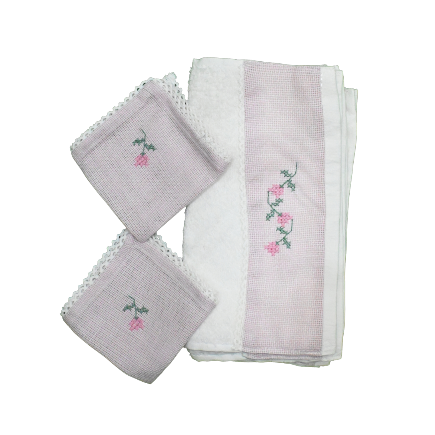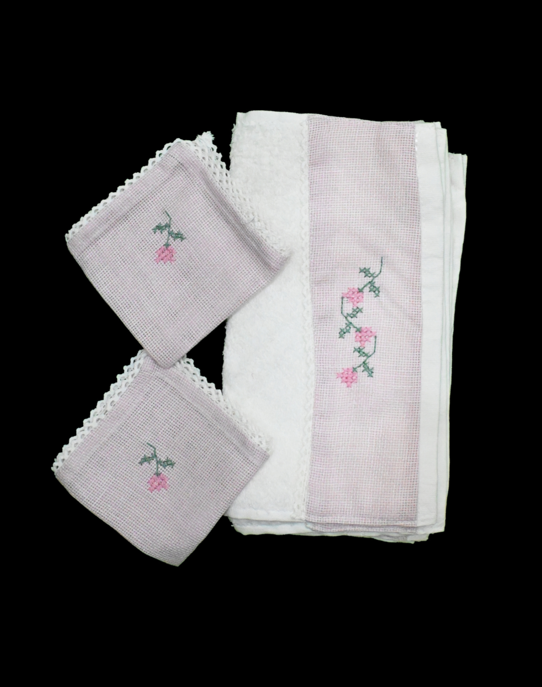 embellished with hand-embroidered cross-stitch detailing, paired with matching hand towels.