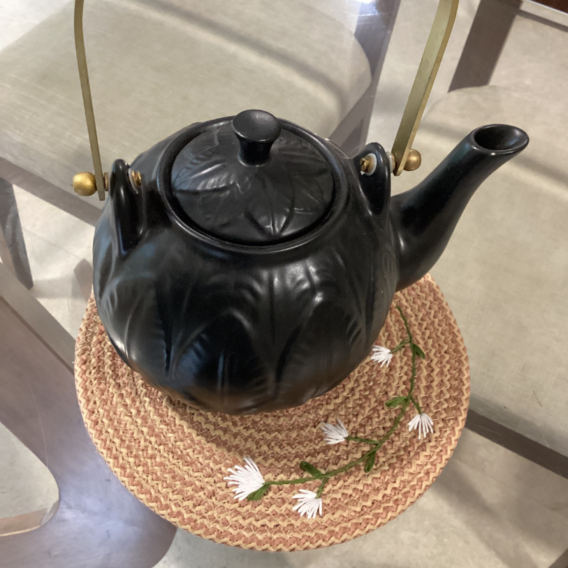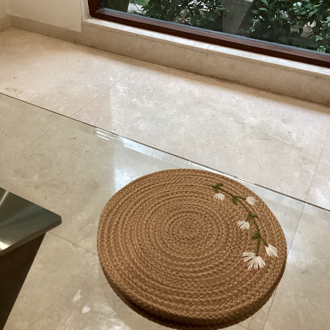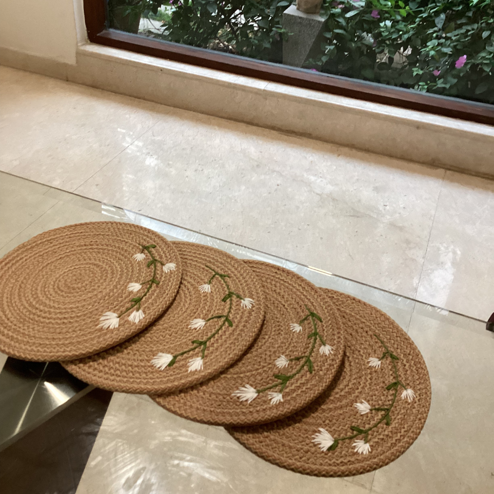 A beautifully cohesive set of four hand-embroidered potmats, each adorned with dainty white flowers and fresh green leaves. Thoughtfully handcrafted on sturdy natural wicker, these potmats offer both elegance and durability.